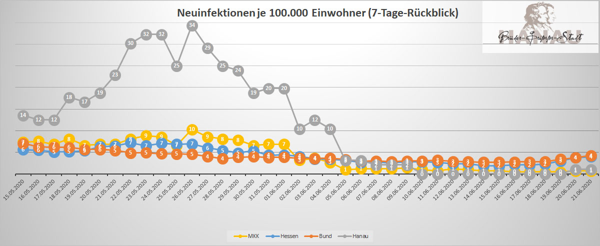 Für Hanau gilt das im besonderen Maße. Die Bundes- und Landesregierungen haben sich darauf verständigt, dass das Infektionsgeschehen künftig lokaler betrachtet werden soll. Als Richtlinie haben sie festgelegt, dass verschärfte Maßnahmen ergriffen werden sollen, wenn innerhalb von sieben Tagen 50 Neuinfektionen auf eine Einwohnerzahl von 100.000 zu verzeichnen sind. Viele Länder haben diese Richtzahl bei 35 Neuinfektionen festgelegt. Diese niedrigere Zahl erscheint mir, zumindest als Vorwarnstufe, sinnvoll.